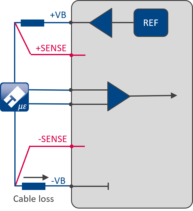센서와 근접한 -0 전위의 -SENSE 도선을 사용하여, 기존의 케이블 손실은 추가된 ADC를 통해 측정되고 정확히 feed & return 2개의 도선만큼 두배의 양으로 보상됩니다. 따라서 온도 드리프트에 의한 동적인 케이블 저항도 보정됩니다. 그리고 excitation voltage 의 전압 강하도 VB와 -SENSE 사이에서 측정되어 오차를 보상합니다.